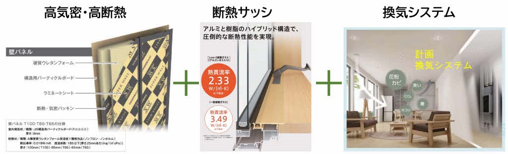 高気密・高断熱のパネルを使用し、高断熱の窓サッシと計画換気システムで