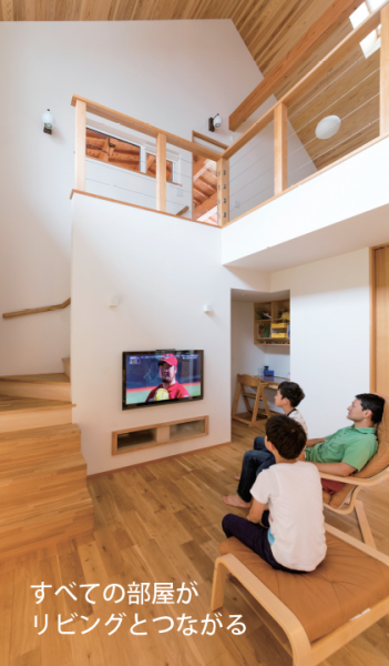 日照シミュレーションによって日当たりを確認したリビングは、吹き抜け上部の窓から1年を通して自然光が入り、明るく気持ちの良い空間になりました。また、2階の子ども部屋やウッドテラス、ロフトには吹き抜けに対して窓がついており、窓を開ければリビングにいる家族と会話できるようになっています。そのため、1階から声をかければ、子どもたちは窓を開けて返事をします。家中を駆け回る兄弟。この家を隅々まで使いこなしているのは、彼らかもしれません。育ち盛りのあふれんばかりのパワーを、家がしっかり受け止めてくれているようです。