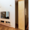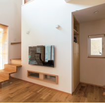 近年、テレビを壁に掛ける家が増えています。テレビボードを置かない分、部屋を広く使えるからです。その際に配線やOA機器も壁の中に収納するとテレビ周辺が散らかることもありません。大塚西の家では、階段下を利用して、配線スペースをつくりました。普段は、可動式の収納棚で塞いでおいて、必要なときに棚を動かして中を確認することができる仕組みです。