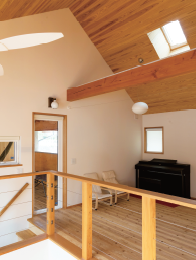 2階の踊り場スペースは仕切らず多目的なファミリー空間に。床と天窓のある天井には無垢の木を採用してつながりも演出