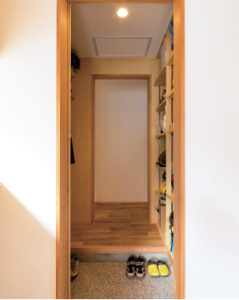 家の中と外をつなぐようなユニークな空間は、日当たりの良さを生かした物干し場、部屋に持ち込みたくないものの置き場所にと大活躍。雨の日でも安心【北側は小さな窓から光を取り込む】
