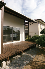 和室、リビングダイニングの延長線のようにつくったウッドデッキ。大きくせり出した 軒のおかげで、夏の強い日差しを遮り、冬は日射を取り入れてくれる。小上がりの和室コーナーは、天井に丸太の皮をはいだ梁を見せる趣向。リビング扉の格子、障子風のアクリル窓も、情緒と落ち着きを醸し出す