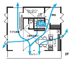 家全体に風の通り道をつくる上で最も重要なのは窓の位置。LDKのある南側の窓から入り込んだ風が室内を通り北側に抜けるよう、子ども部屋スペース、寝室に窓を設け、西側には弱い風でも効率よく取り込むことができるように縦滑り出し窓を採用しました。また、生活の中心となるLDKが2階にあるM様邸では、立体通風を計画することも重要。1階からの風は階段を通り2階に、そして吹き抜けを通りロフトに抜けるようにして、より快適な住まいが実現。ロフトへの風の通り道をつくることで、夏のムワッとした温かな空気を逃がす役割も果たしてくれます。