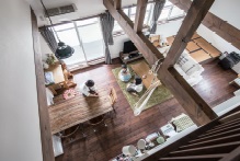 ロフトへは梯子ではなく奥様の希望で階段を設置。階段にしたことで、ロフトへの昇降が楽にできるので子どもたちの遊び場や寝室として利用するなど、日常での使い方の幅が広がった。この縦長の空間に階段を設置しても圧迫感がないのは、北側に設けた空間に窓が抜け感をもたらしてくれているため