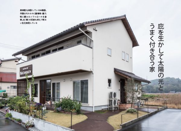 美容院も併設しているM様邸。外壁はモルタルに耐候性・耐久性に優れたソフトロールを塗装。光(熱)の反射も考えて明るい色を採用している