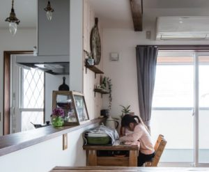 「家づくりは本当に楽しかった」という奥様。その思いが特に現れているのが、作家活動もされている奥様のアトリエ(ミシン室)。玄関を入ってすぐの1階に設けられたその部屋でミシンに向かうと、目の前には可愛い小窓が。これは作業中でも外から帰ってきた子どもたちの顔を見て「お帰り」と言ってあげられるようにと、奥様のアイデアで設置したもの。建具の塗装も奥様のDIY。その他にも家の中のいたる所に、夫婦でDIYした家具があふれ、住まいを育みながら、暮らしを楽しんでいる様子が印象的でした。