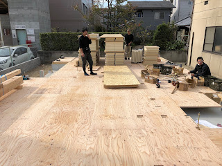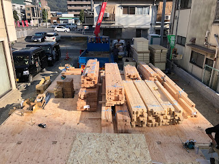 大きな木材を段取りよく組み立てて行く大工さんたち、