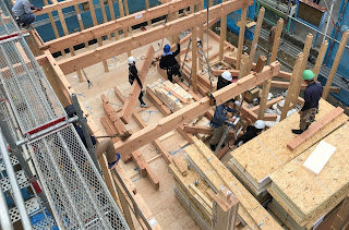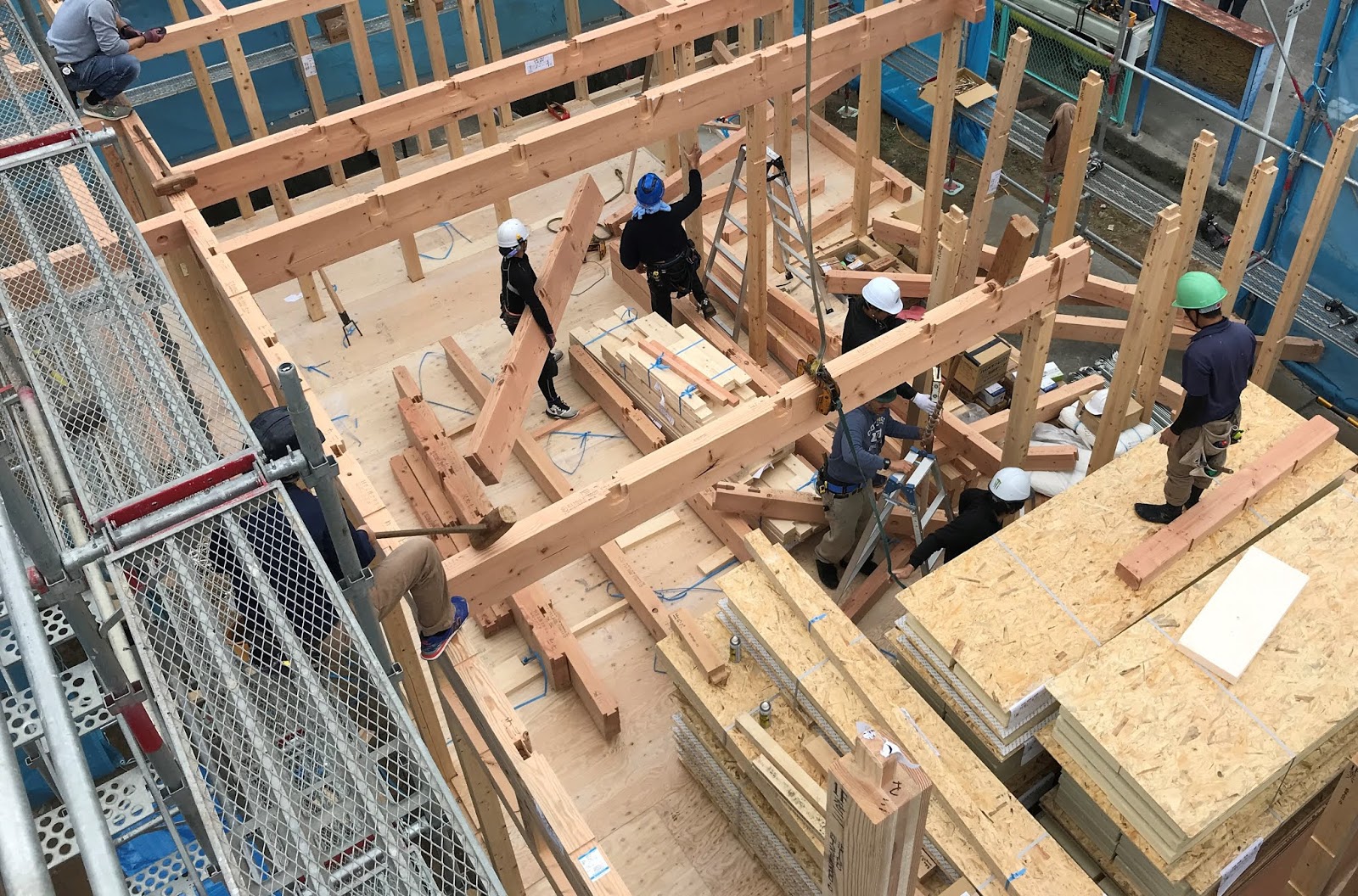 大工さんたちが、慣れた様子で長くて重たい木材を運び、